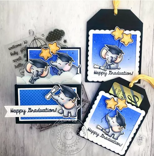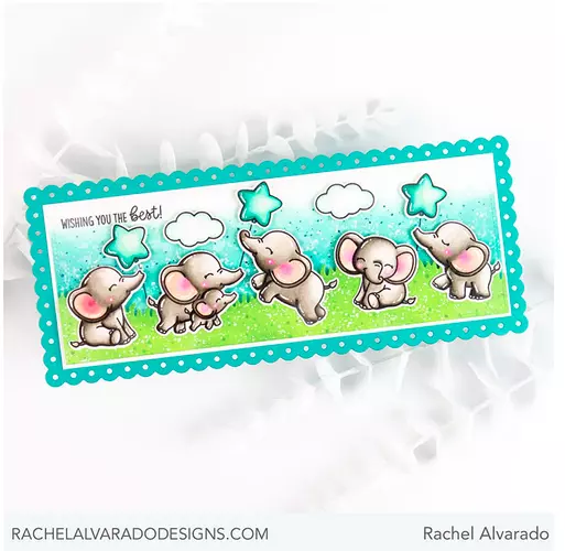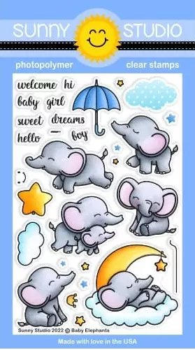 ¡Estos gentiles gigantes son demasiado lindos para resistirse! Este dulce conjunto de sellos cuenta con 6 imágenes de elefantes únicas, junto con imágenes de nubes, estrellas, globos y sombrillas coordinadas para crear escenas y 8 palabras para mezclar y combinar para crear una serie de saludos divertidos perfectos para tarjetas de bebés y mucho más.