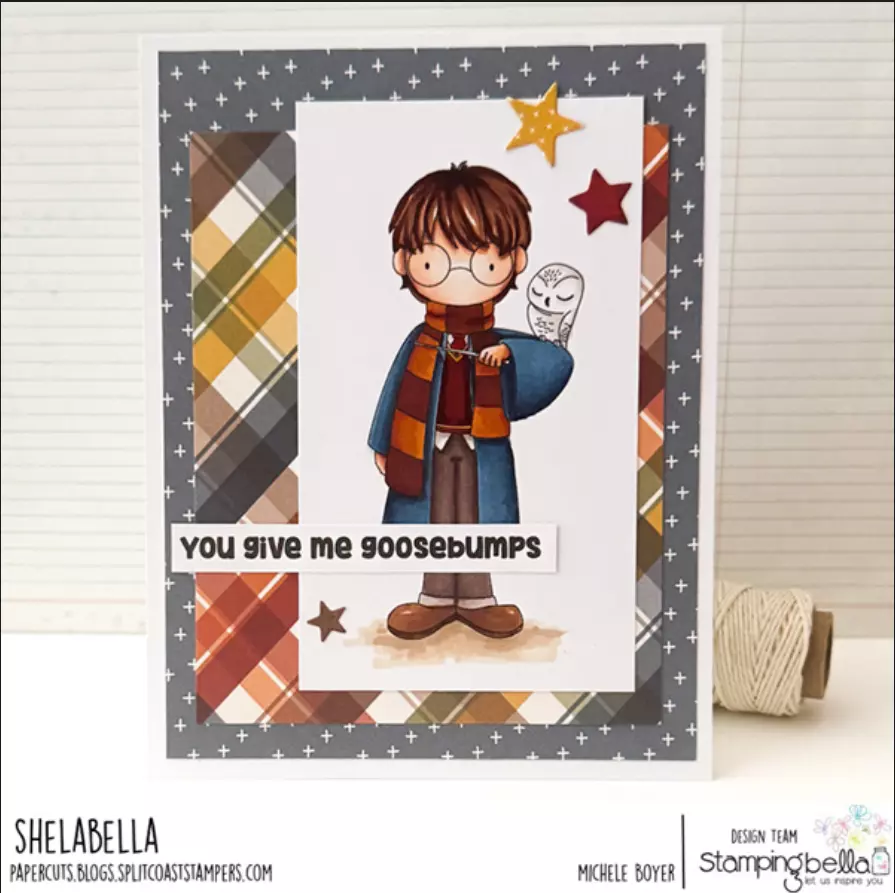 Tiny Townie, con gafas redondas, bata escolar y una bufanda a rayas. Su compañero búho encaramado añade un toque entrañable y mágico. La combinación de accesorios icónicos e ilustraciones lúdicas evoca el espíritu de aprendizaje, lealtad y encanto cotidiano